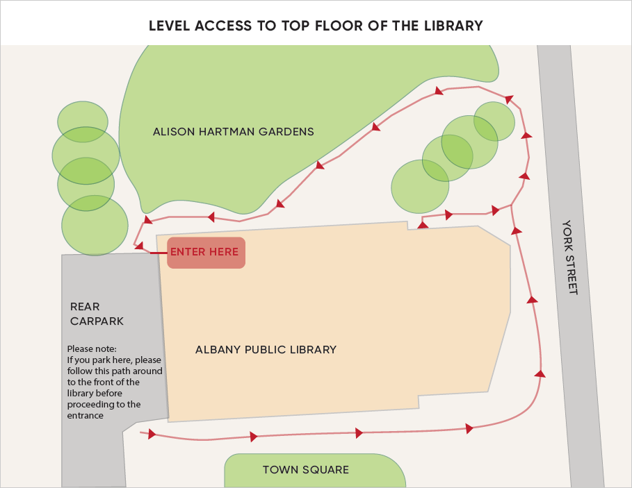 > Use the path along the north side of the library (via Alison Hartman Gardens).
